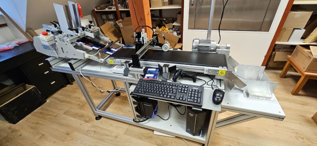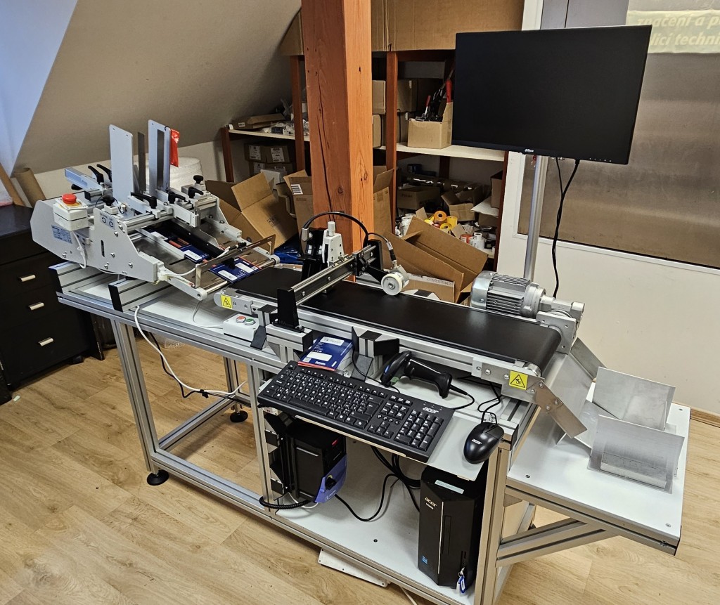 Tato aplikace představuje řešení pro automatický potisk složených kartonových krabiček přímo ve výrobním procesu. Krabičky jsou podávány pomocí podavače a následně transportovány dopravníkem pod tiskové hlavy, kde probíhá bezkontaktní tisk.